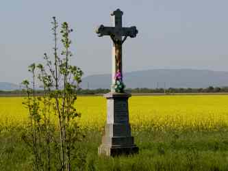 dvojramenny kriz umiestneny na kopcoch. Napriek